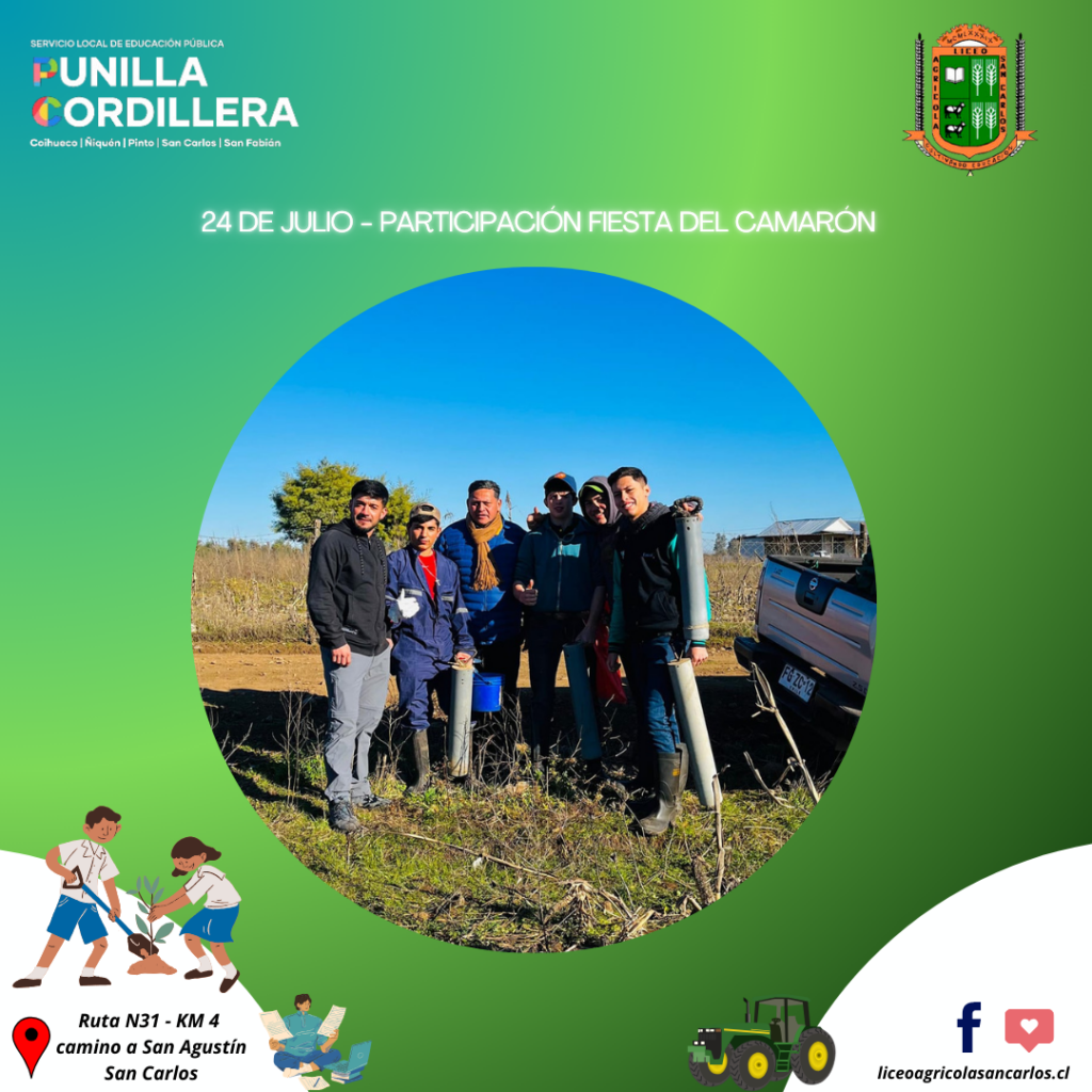 Desde nuestro Liceo Agrícola San Carlos queremos felicitar la participación de todos nuestros estudiantes en el Festival del Camarón . Realizado hoy en la Escuela de Chacay, en la comuna de Ñiquen. Nuestras felicitaciones a nuestro estudiante John Aravena Avello Leer más …