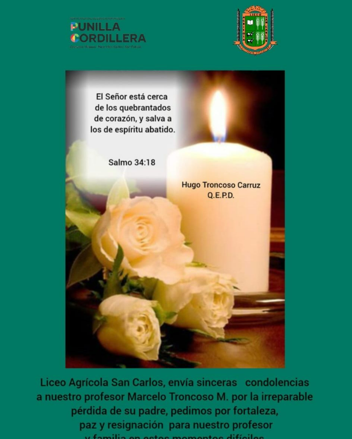 ⚫️🤍🕊🤍⚫️ Desde nuestro Liceo Agrícola San Carlos compartimos que ha fallecido el padre de nuestro profesor Marcelo Troncoso M, confiamos en que la fortaleza divina sea con nuestro profesor y toda su familia en este momento difícil. ⚫️🤍🕊🤍⚫️ Don Hugo Leer más …