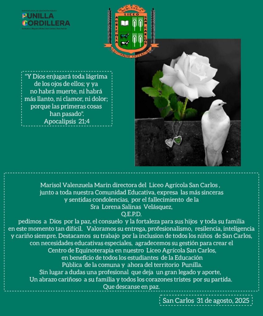 Hoy nuestro despertar fue triste, es por ello que queremos enviar con mucho respeto y cariño nuestras sinceras condolencias para los hijos y toda la familia de la:Sra. Lorena Salinas VelásquezQ.E.P.D.Una profesional que se caracterizó por su gran resiliencia y Leer más …